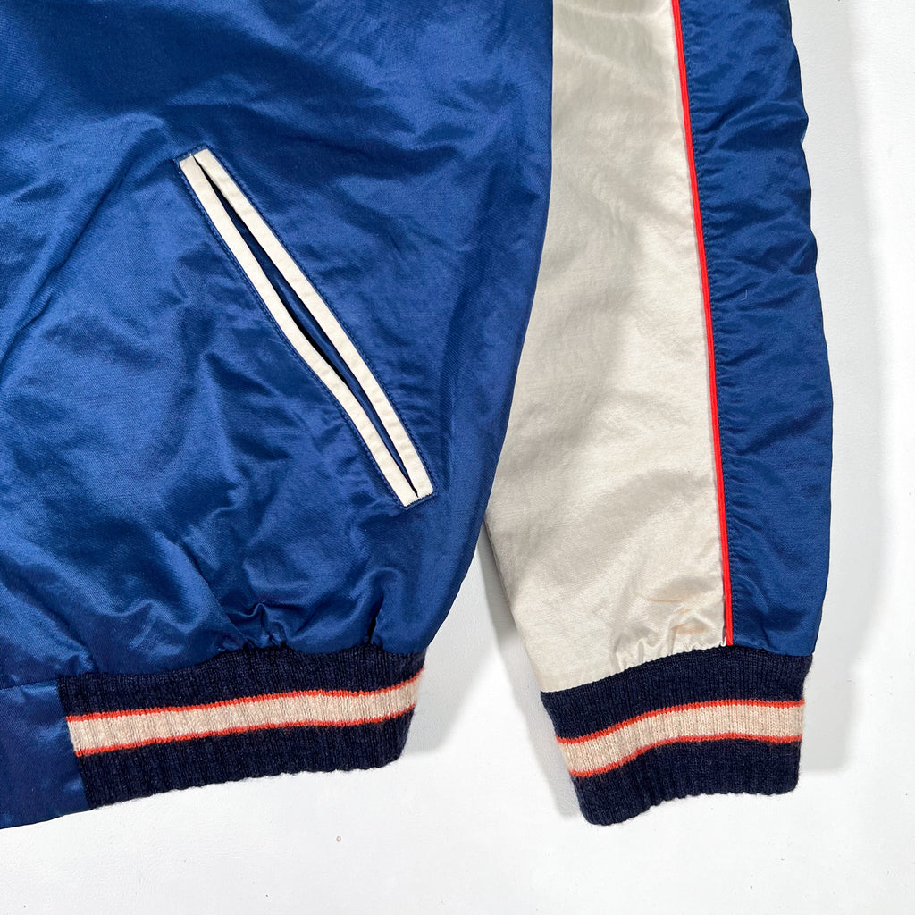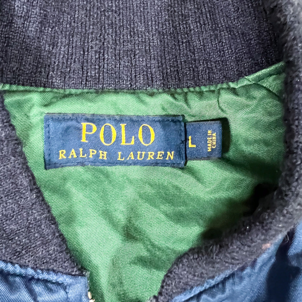 Constructed with a satin-style nylon shell, this jacket includes a full zip front, slanted hand pockets, and striped rib-knit collar, cuffs, and hem. The bold blue body is paired with cream sleeve panels and red piping for contrast. Interior Polo Ralph Lauren label with separate size tab, marked Large, is consistent with late-90s to early-2000s production.