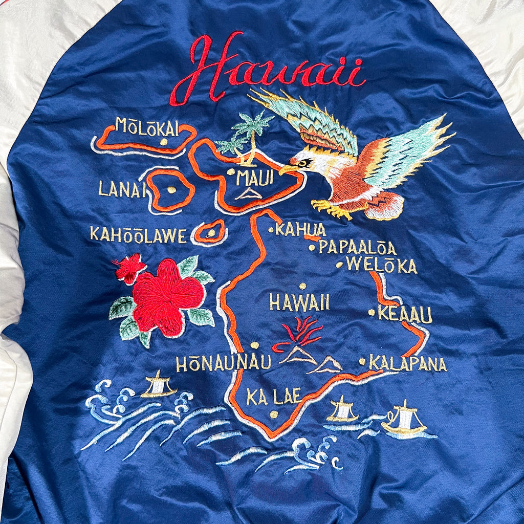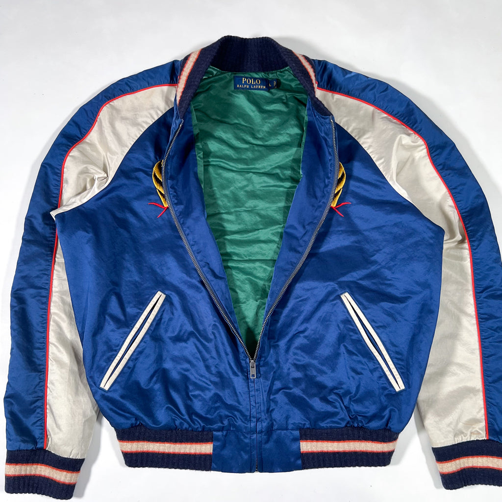 Polo Ralph Lauren souvenir jacket, Polo Ralph Lauren bomber jacket, Polo tiger jacket, Hawaii map embroidered jacket, sukajan style jacket, vintage Polo Ralph Lauren jacket, Y2K Polo jacket, embroidered bomber jacket, satin bomber jacket, souvenir tour jacket, Hawaii souvenir jacket, blue satin bomber, Ralph Lauren tiger embroidery, vintage bomber jacket, men’s vintage jacket Large
