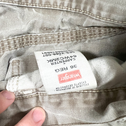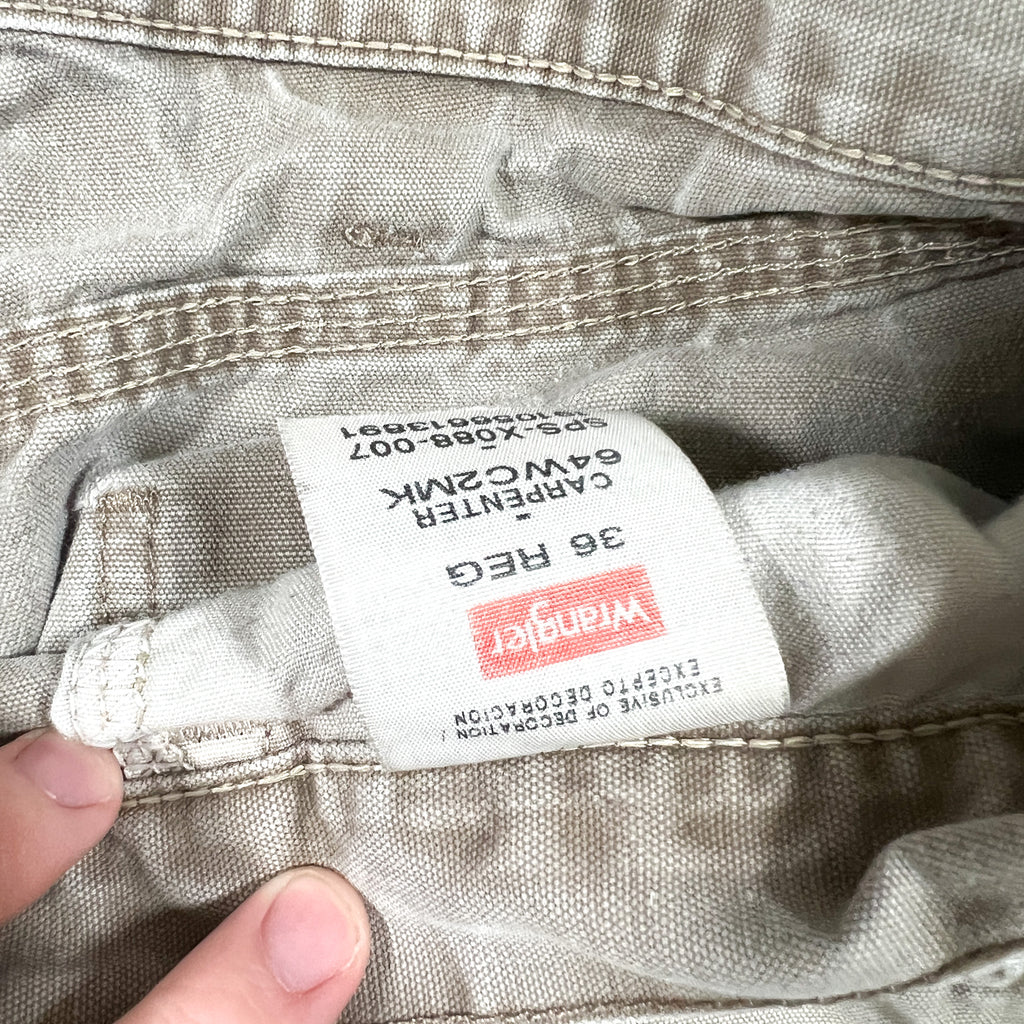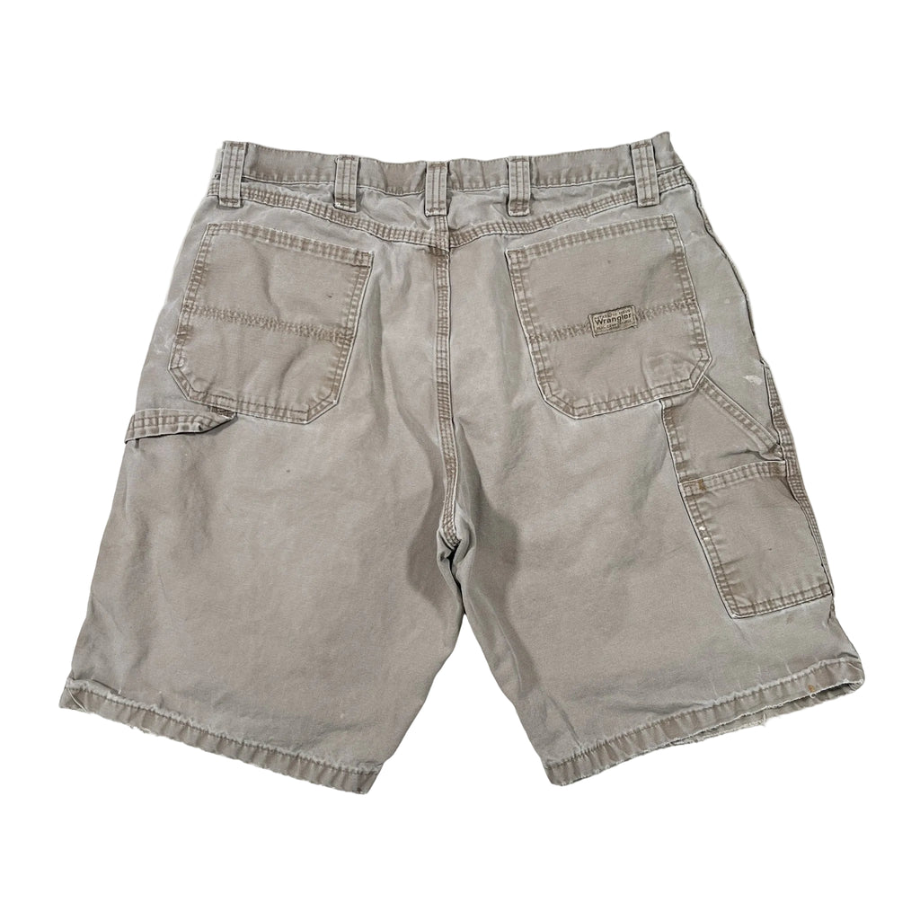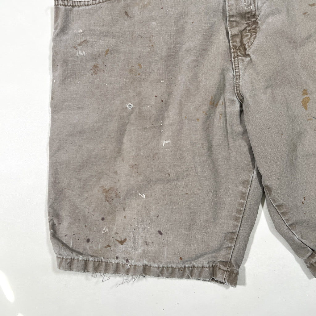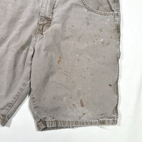 Vintage Y2K Wrangler carpenter shorts in a faded khaki color. Classic workwear style with utility pockets and hammer loop, featuring natural paint splatter and wear throughout that gives them a great authentic worn-in look.